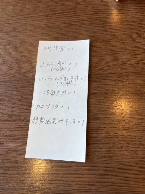 妻と子供たちは上ちらし寿司、いくらねぎまぐろ丼、いくら鉄火丼を注文。オーダーは紙に手書きするスタイルでした。(これも写真忘れました…)